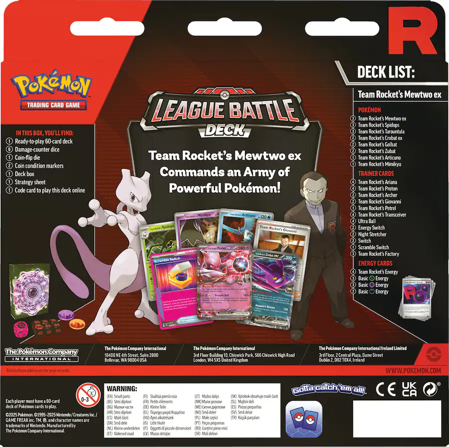 התכוננו לשלוט בזירה עם אחת הדמויות האייקוניות והחזקות ביותר בעולם הפוקימון. חבילת ה-League Battle Deck של Team Rocket’s Mewtwo ex מיועדת לשחקנים שרוצים לקחת את המשחק שלהם צעד אחד קדימה עם חבילה ברמה תחרותית, הבנויה סביב אסטרטגיה מתוחכמת וכוח מתפרץ.